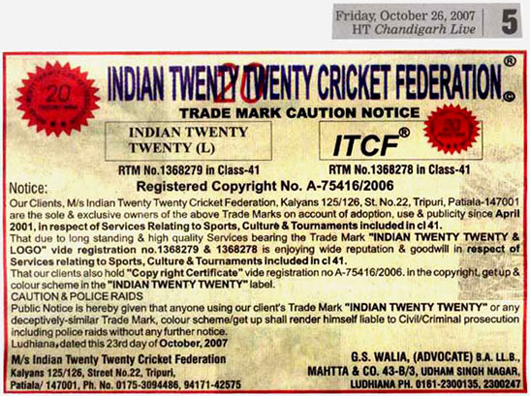 Our clients, M/s Indian Twenty Twenty Cricket Federation,
